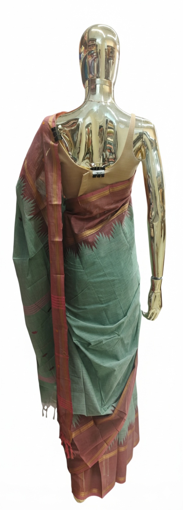 The “Temple” design where the green body meets the mauve border is the most noticeable characteristic. In South Indian weaving, this is a traditional motif.