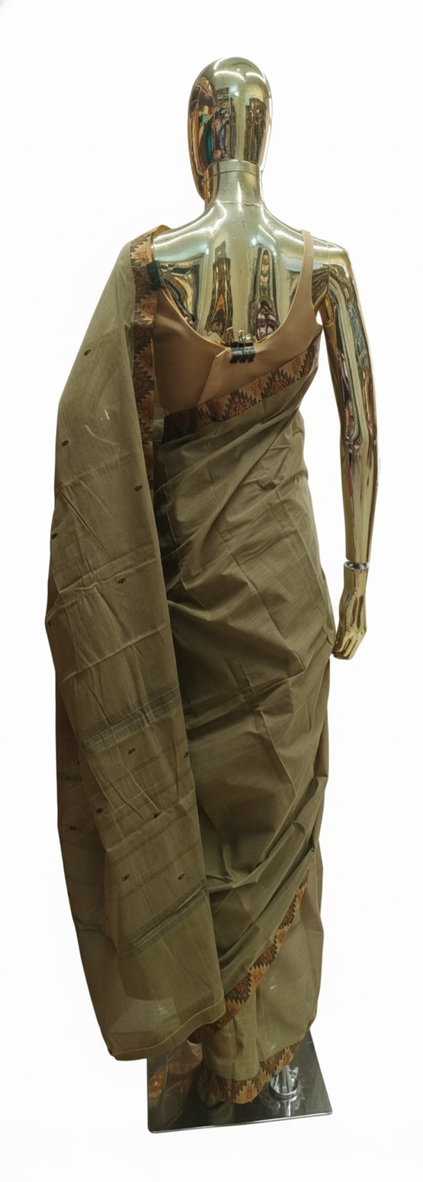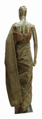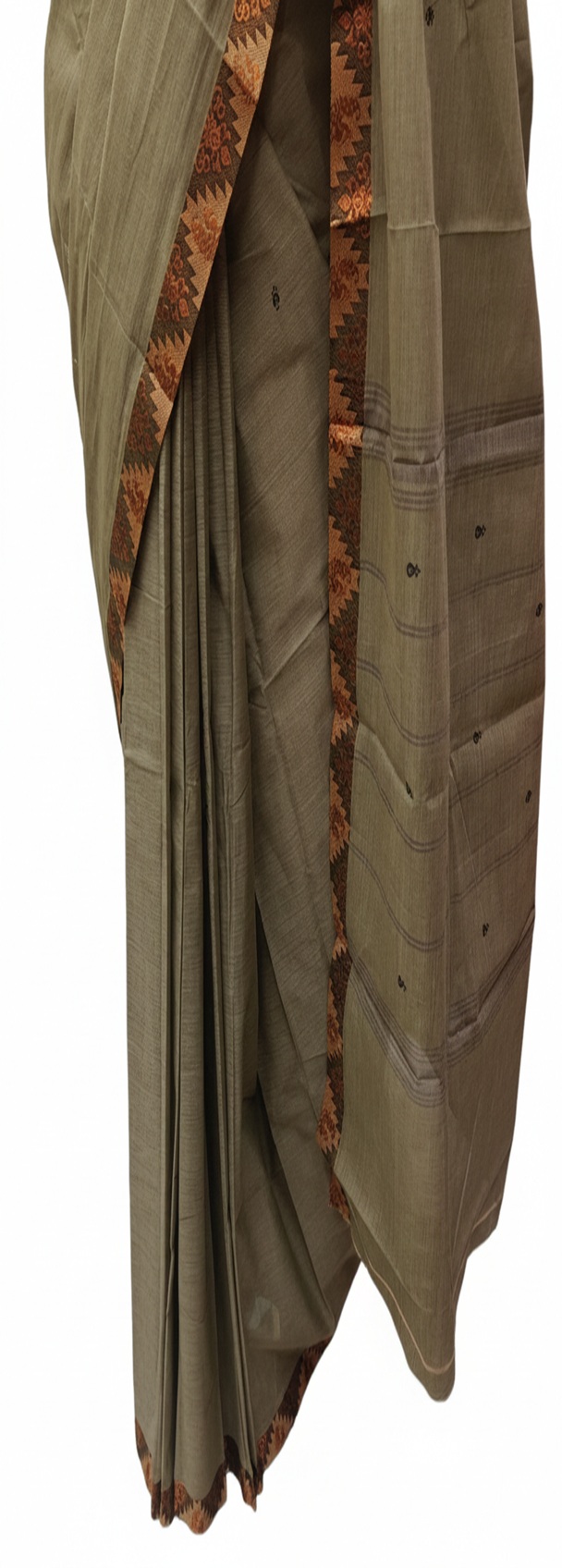 The primary body of the Cotton saree is a muted sage green or taupe with a visible slub texture .It features small, minimalist buttis (dotted motifs) scattered across the fabric, providing a subtle contrast without overwhelming the base color. The standout feature is the temple-style geometric border. It uses a palette of rust orange, black, and cream in a repetitive triangular or “karvati” pattern, giving it a traditional ethnic look.
