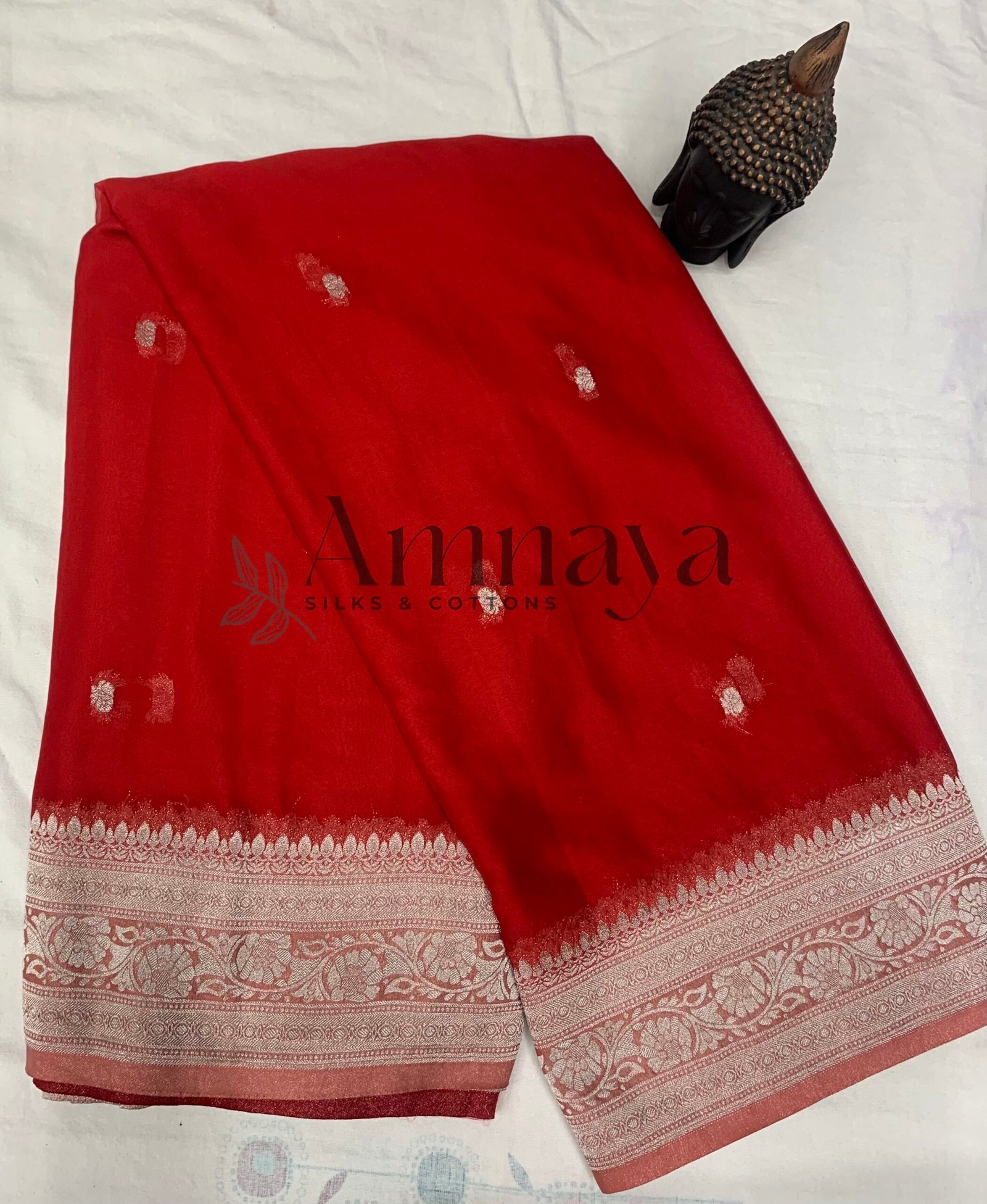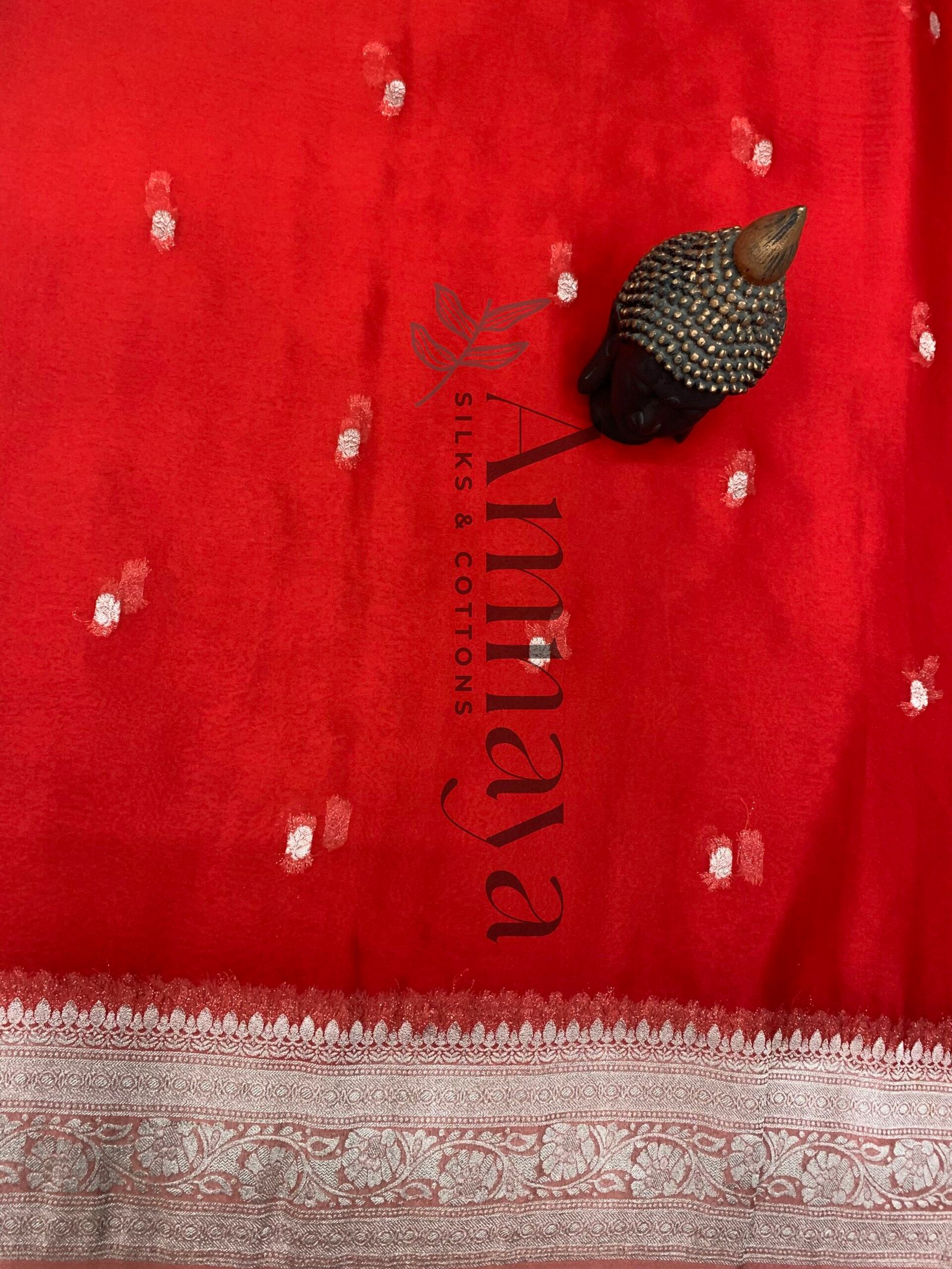 Grace meets glamour in this Scarlet Silver Elegance Red Chiffon Saree adorned with delicate silver zari butti motifs and a floral border. Perfect for festive and wedding occasions, this lightweight drape exudes timeless sophistication.