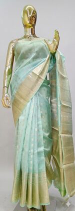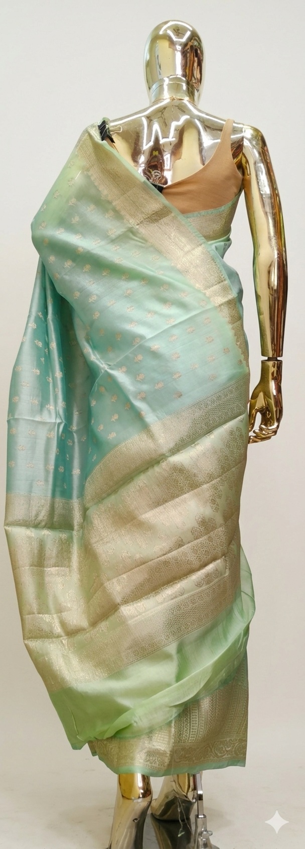 A soft, refreshing Sea Blue (leaning towards a pale mint or aqua). The pastel hue gives it a contemporary yet sophisticated look.It is  a  high-quality  Silk. It has that characteristic subtle sheen and a crisp, lightweight drape that holds its shape well.