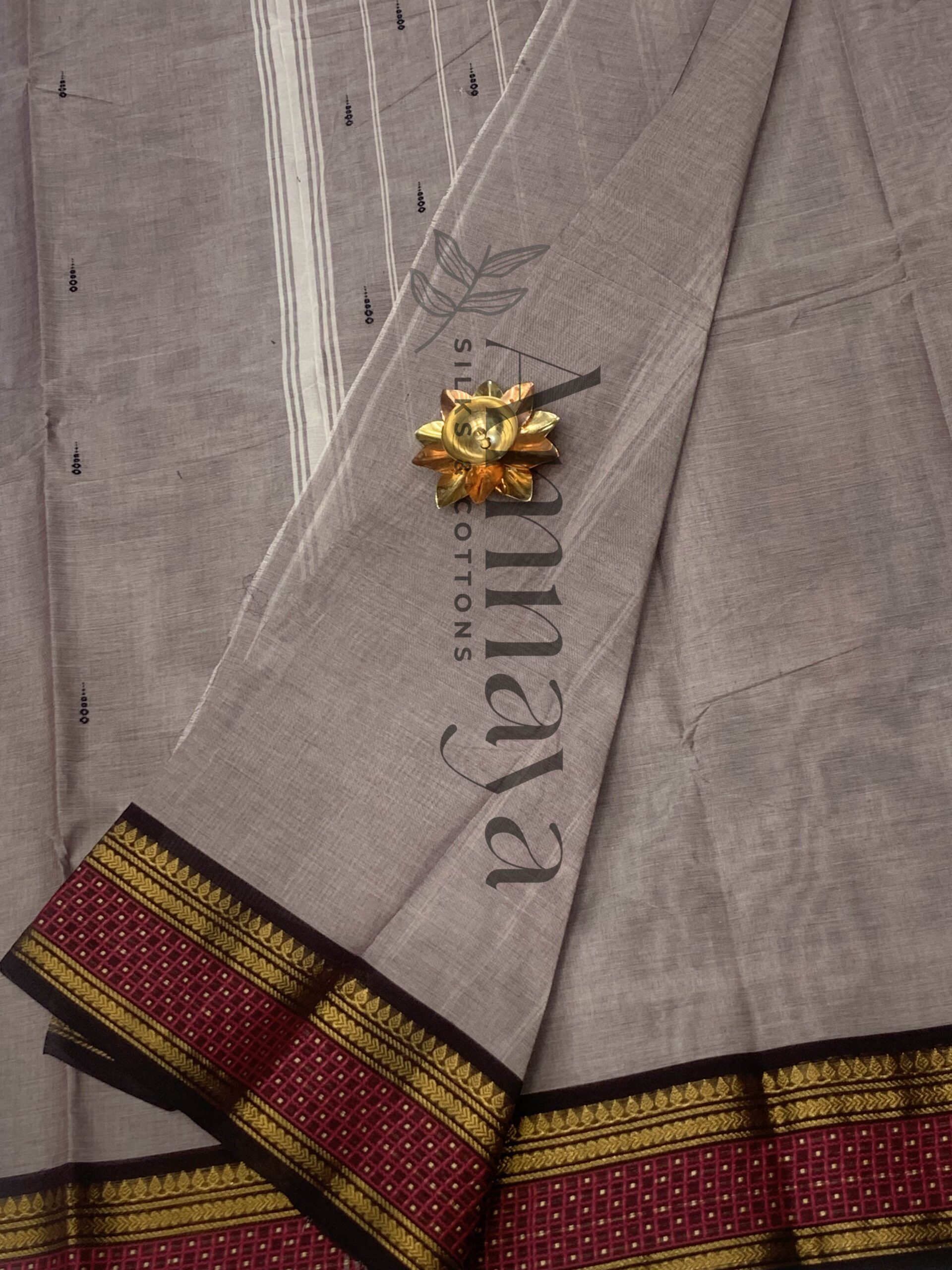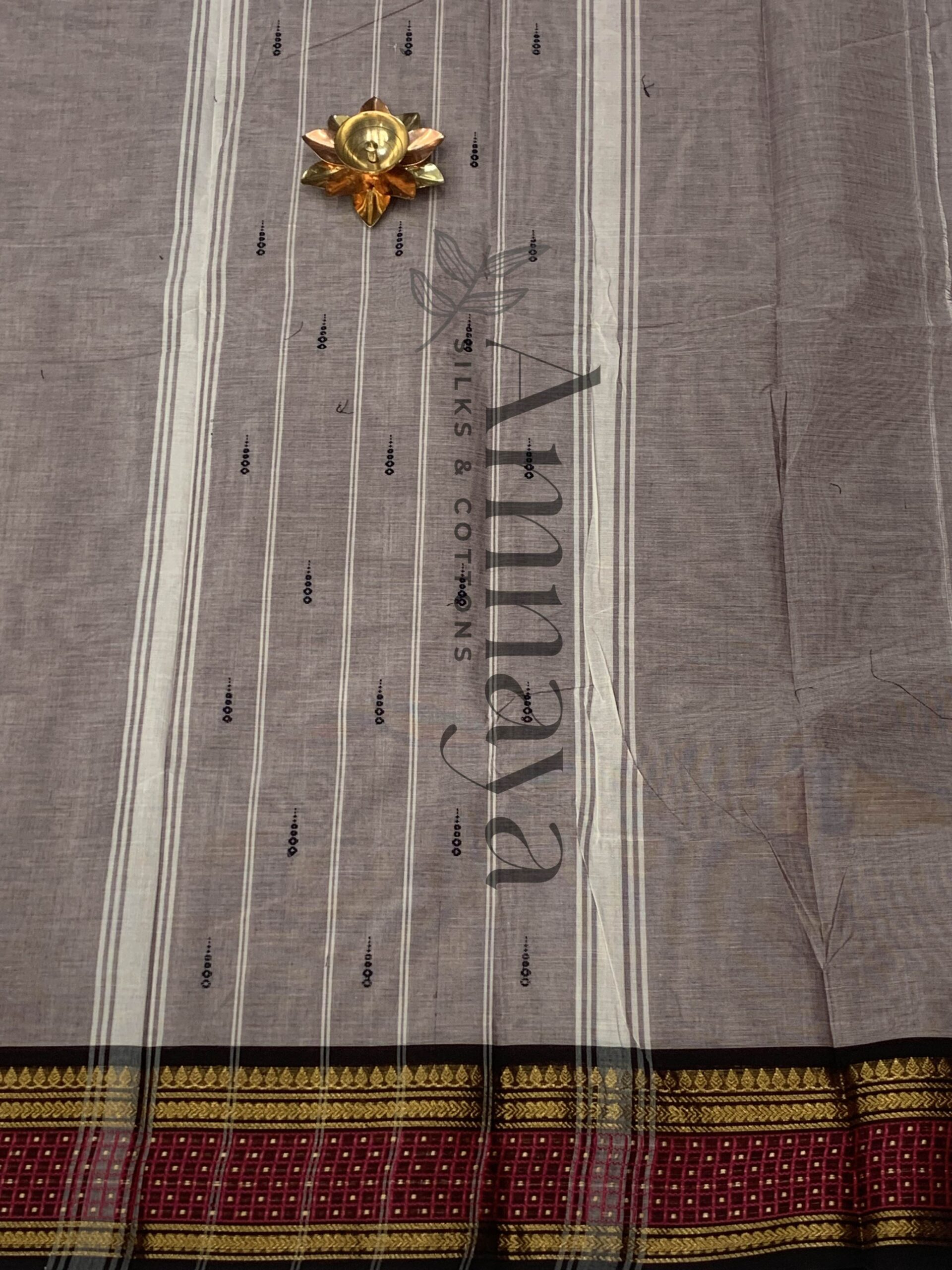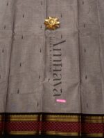 Elegant smoky grey handloom cotton saree with subtle buttis and rich maroon-gold temple border. Lightweight, breathable, and perfect for daily wear, office, and festive occasions. Comes with a matching blouse piece.