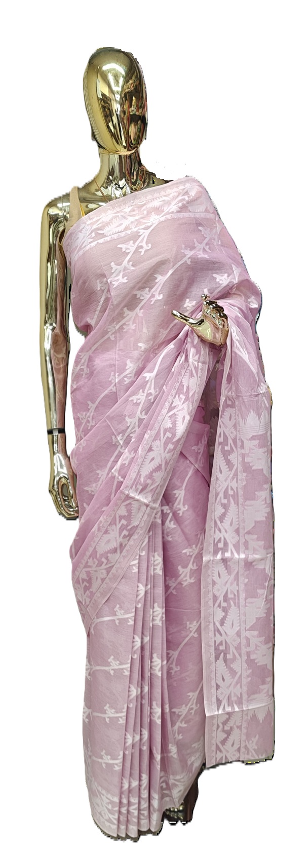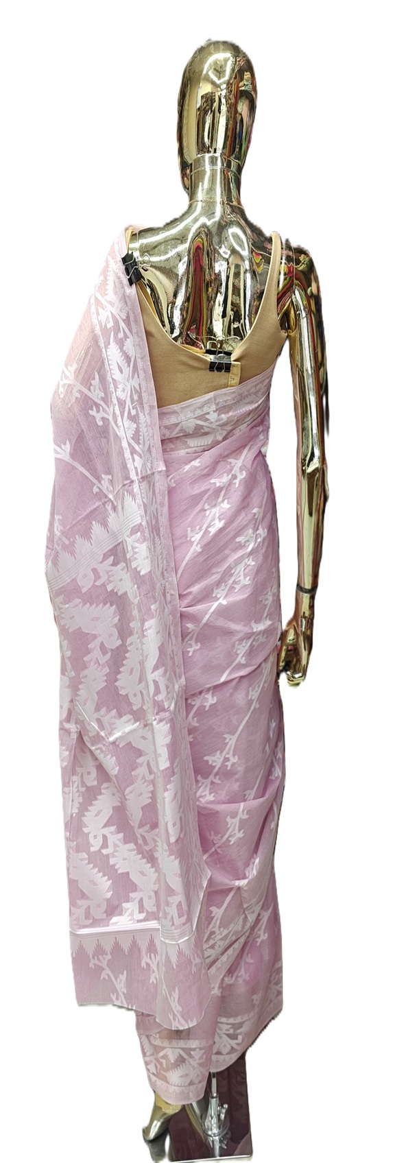 The Soft Pink Bengal cotton saree  highlights the timeless beauty of traditional handloom artistry.  Woven from pure Bengal cotton, has tiny white flower designs scattered equally throughout the body, giving it a subtle yet exquisite beauty. The pallu and border are embellished with classic woven designs that add ethnic appeal without dominating the fabric’s softness.