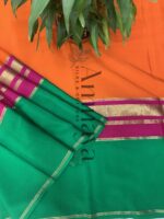 Elevate your ethnic wardrobe with the timeless elegance of the Asmita Tricolour Pure Crepe Zari Border Saree. Designed with a striking blend of vibrant orange, rich magenta pink, and deep emerald green, this saree is a perfect harmony of tradition and contemporary charm. The luxurious pure crepe fabric offers a smooth, fluid drape that enhances your silhouette effortlessly.